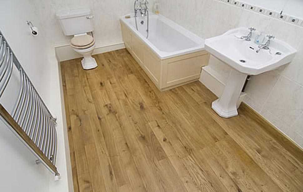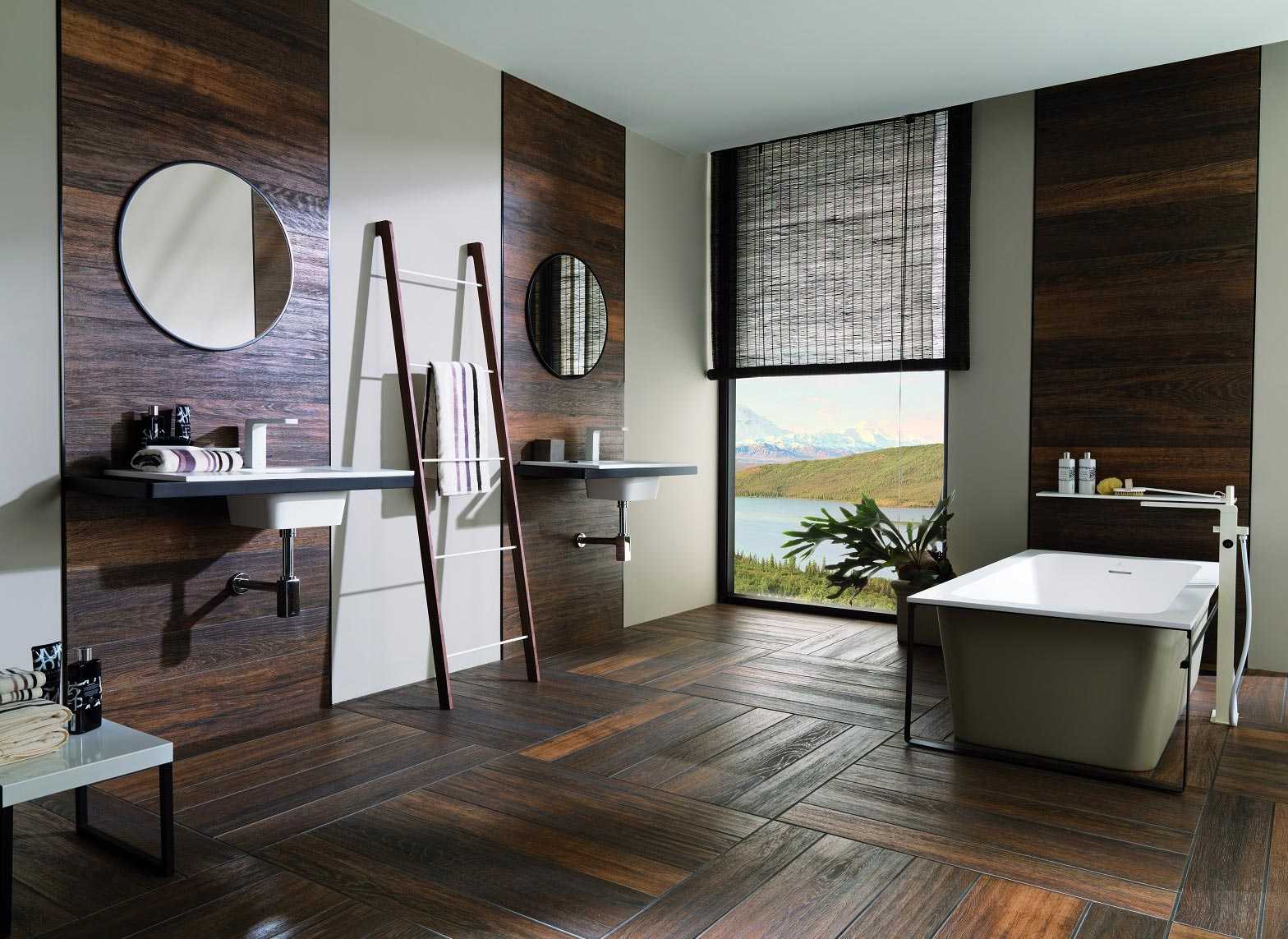 Для оформления пола ванной комнаты не используется натуральная древесина из-за неустойчивости материала к высоким температурам и повышенной влажности. Однако можно воспроизвести имитацию укладки досок с помощью керамических изделий.