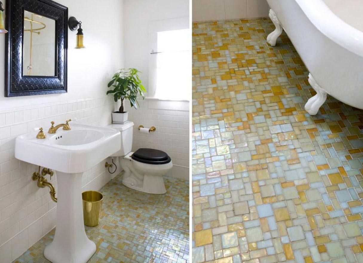 При реализации проекта ванной можно создать необычное напольное покрытие. Специалисты предлагают варианты отделки под массив дерева, укладку по типу пчелиных сот, сложные мозаичные орнаменты, стилизацию под каменные породы.