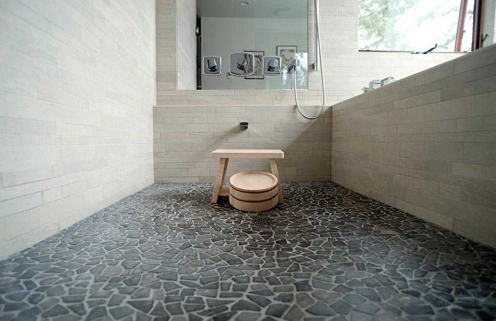 Оформление пола каменными породами применяется в классических интерьерах, при реализации ванных в стилях барокко, рококо. Покрытие отличается долговечностью, износостойкостью, эстетичностью.