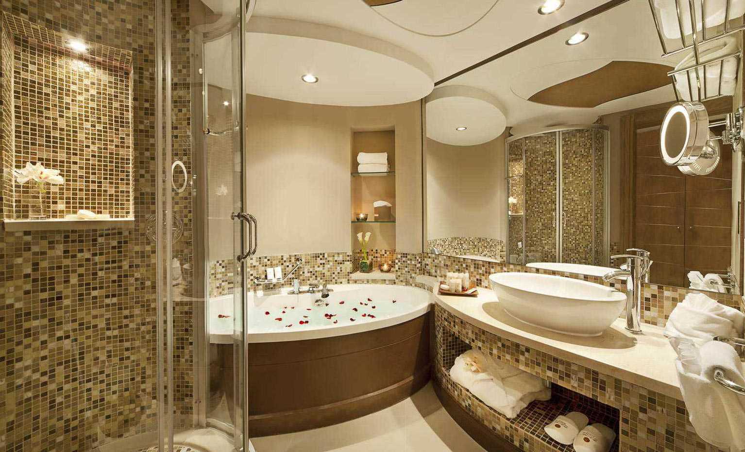 Можно выбрать вставки, большие панно с растительными мотивами, оформить зеркала и сантехнику мозаикой.