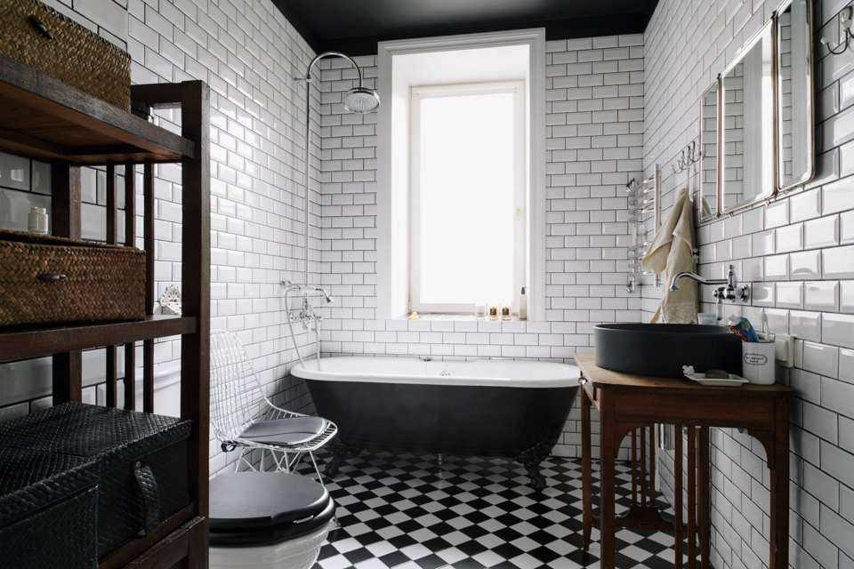 В светлой, белоснежной ванной, красиво смотрится черно-белый пол, с плиткой, расположенной по диагонали. Такая композиция увеличит интерьер оптически. Эта классическая концепция привлечет в первую очередь поклонников элегантного антуража ванной с модным намеком на ретро, арт-деко.