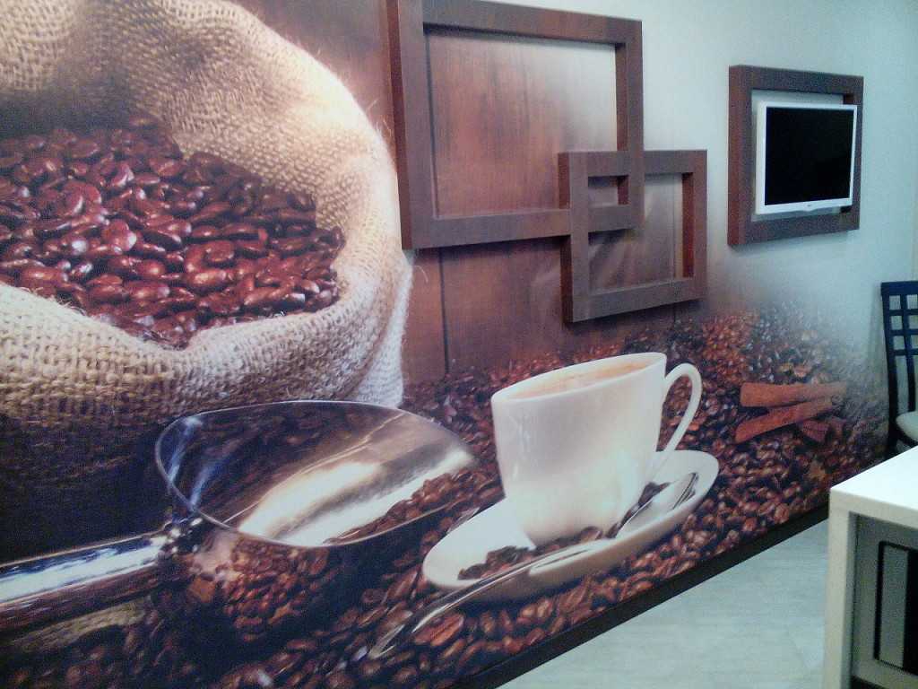 Неплохо смотрятся обои с изображением кофейных зерен или силуэтами чашек для кофе. На наш взгляд, лучше комбинировать их с другими покрытиями бежевых и светло-коричневых тонов. Так вы создадите уютную атмосферу. Такое решение — идеально для прованса, стиля кантри или кафе.
