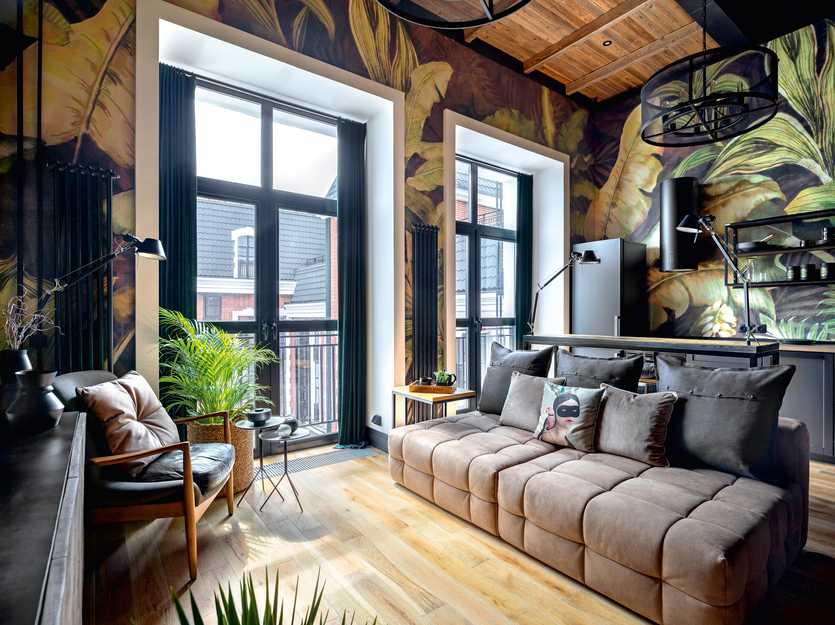 Совет: если вы предпочитаете зрительно уменьшить большой интерьер и сделать его более уютным – остановите выбор на обоях с яркими элементами на тему природы, а также светлыми покрытиями с насыщенными принтами.