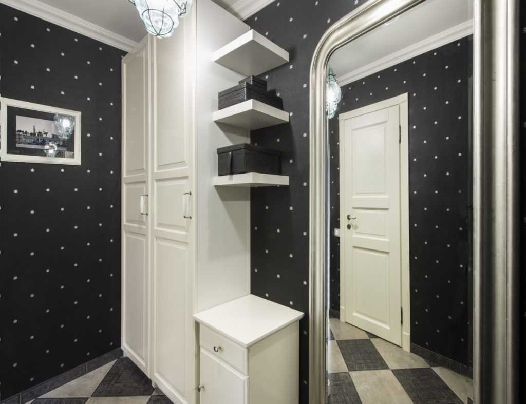 Смело в интерьере маленькой прихожей будет смотреться контрастное сочетание черного и белого цветов. С подобными решениями следует быть осторожнее. Например, в очень маленьком помещении на стены можно наклеить белые обои, а потолок отделать такой же светлой штукатуркой. Контрастный кафель черного цвета с ромбовидными узорами разбавит собой такую отделку. Завершите ансамбль маленькой кованой люстрой и деревянной темной лавкой, стилизованной под старину.