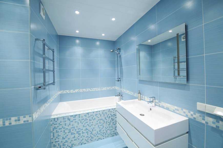 Цвет воды и неба в ванной как нельзя более уместен, по популярности он уступает только белому. Хорош в одиночной укладке и в сочетании с другими оттенками. Любите морской стиль – синий и голубой подойдут как нельзя лучше.