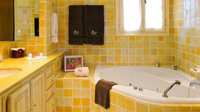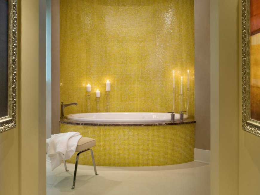 Жизнерадостные солнечные тона – это отличный выбор для большой и маленькой ванной. Он не сделает комнату тесной, но поможет визуально приподнять потолок.