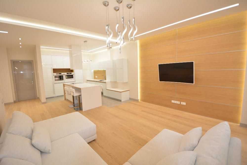 Создается абсолютно ровная поверхность, под которой не заметны какие-либо огрехи строительства. Неровности и места стыков потолочных конструкций будут тщательно замаскированы от посторонних глаз. Чтобы потолок не выглядел уныло и однообразно, можно вмонтировать в него светильники «рыбьи глаза», подвесить оригинальную и красивую люстру, декорировать лепниной или молдингами либо просто покрасить в цвет, гармонирующий с интерьером.