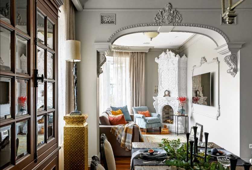 Благодаря творческому подходу можно обустроить в комнате камин с интересным порталом, что придаст интерьеру уникальность.