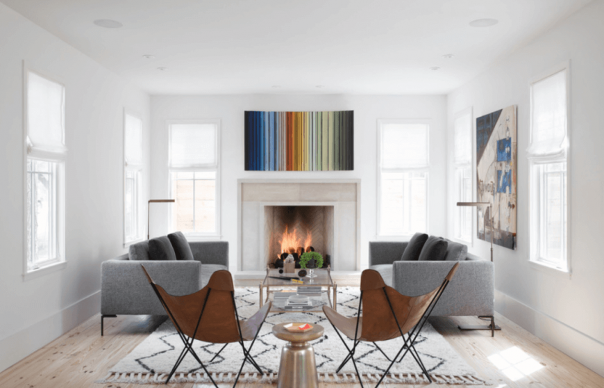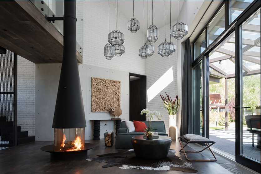 Подвесной. Прибором с лаконичным порталом и длинным дымоходом оптимально дополнять модернистские гостиные: в стиле минимализм, лофт, mid-century modern.