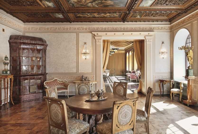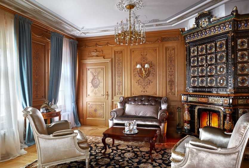 Форма портала классического камина выполняется в виде литеры «П» и имеет массивные очертания, зачастую с украшениями в виде колонн или напоминающих их барельефов. Материалом для портала чаще всего выступает мрамор, малахит или дерево, а при возведении камина в английском стиле используются чугунные кованые детали – решетки, ограждения и т. п.