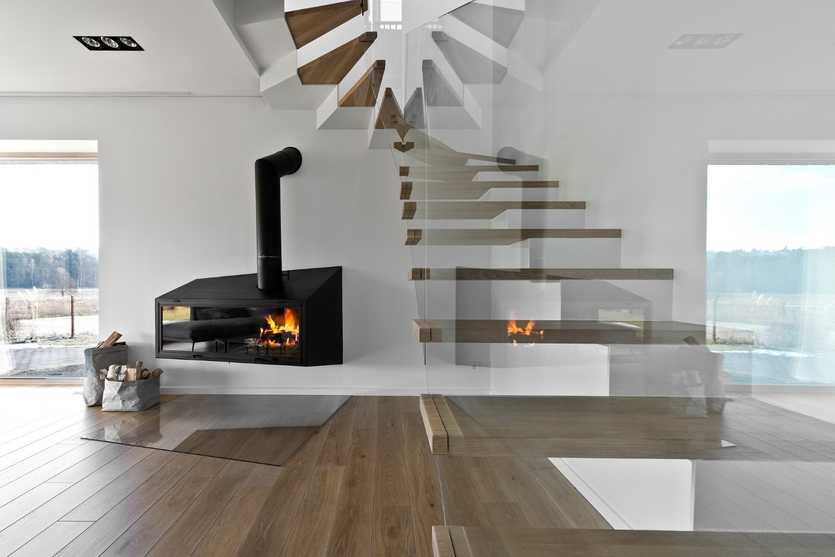 Современные стили любят камины в пространстве. Небольшая модель в винтовой лестнице становится продолжением интерьера. Панорамное решение под стеклом устанавливают в колонну. На полу отлично смотрится вариант с огненным островом.