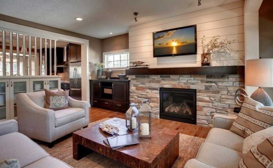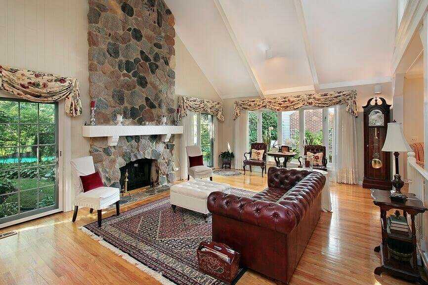 Интерьер гостиной с камином в частном доме часто становится центральным и продуманным до мелочей. Чтобы сделать обстановку уникальной, достаточно использовать для отделки камина натуральный камень – он имеет оригинальный рисунок и оттенок. Среди преимуществ природного камня перед другими материалами: