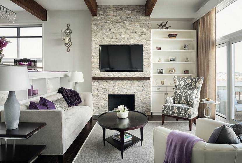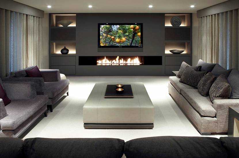 - Ни в коем случае не размещайте телевизор над камином – это грубое нарушение правил безопасности. Самый идеальный вариант расположения тв-зоны – рядом с камином. Так огонь не будет мешать наслаждаться просмотром фильма.