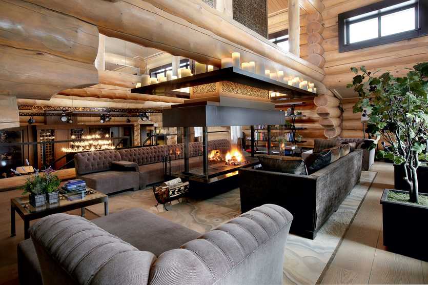 Форма и размещение камина зависит от концепции дизайнера. В объединенной гостиной и столовой конструкция в фальшивой перегородке поможет зонированию. Варианты в прозрачной стене привносят в комнату фантастические нотки.
