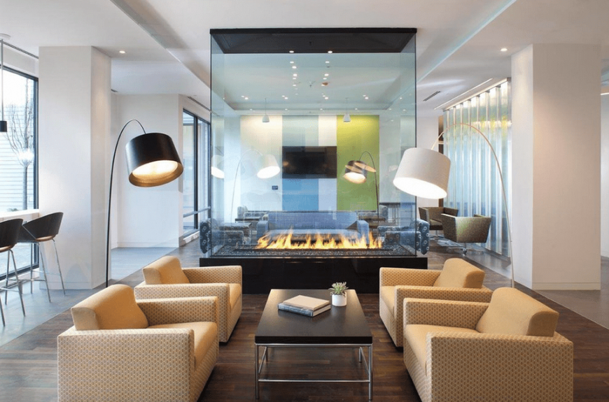 Современным камином в интерьере можно визуально исправить помещение. В узкой гостиной поперечная стена из стекла с ложным очагом у основания проводит границу между функциональными зонами. Разделенная комната не теряет первоначальной целостности.