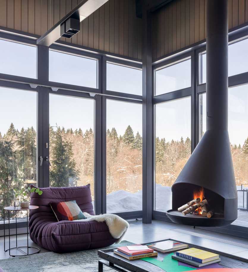 Скандинавский стиль сложно представить без камина в гостиной. В светлое помещение естественно впишется компактный очаг в одном из углов. Цилиндрическая топка с длинной трубой почти незаметна рядом с лестницей. Лаконичный черный портал с нишей-поленницей станет видимой деталью в интерьере.