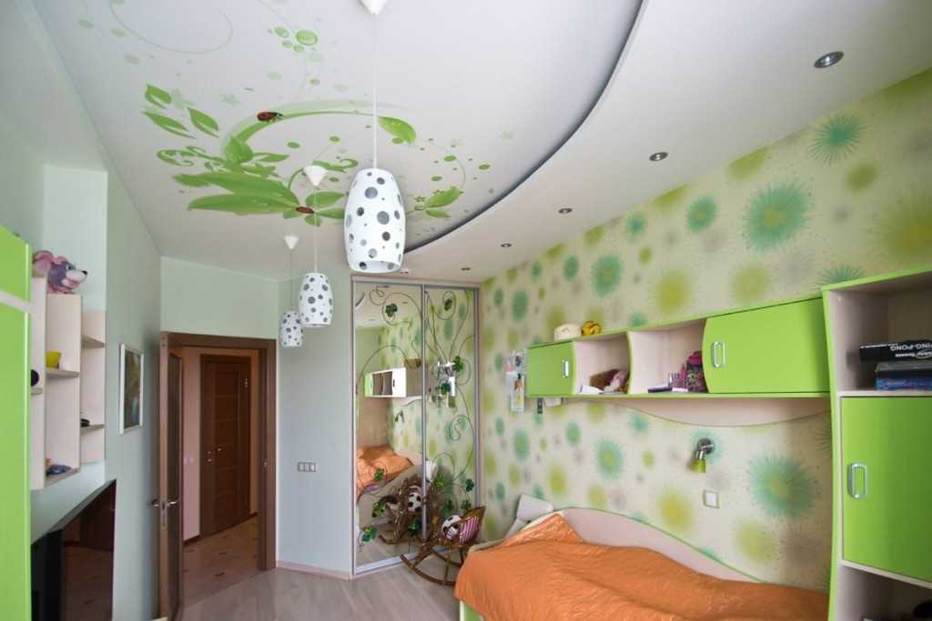 В маленькую комнату для подростка смело выбирай натяжной потолок. Он почти не занимает пространство, не требует выравнивания основания и визуально увеличивает помещение. Помимо глянцевого покрытия есть элегантные матовые, изящные сатиновые и даже уютные текстильные коллекции.