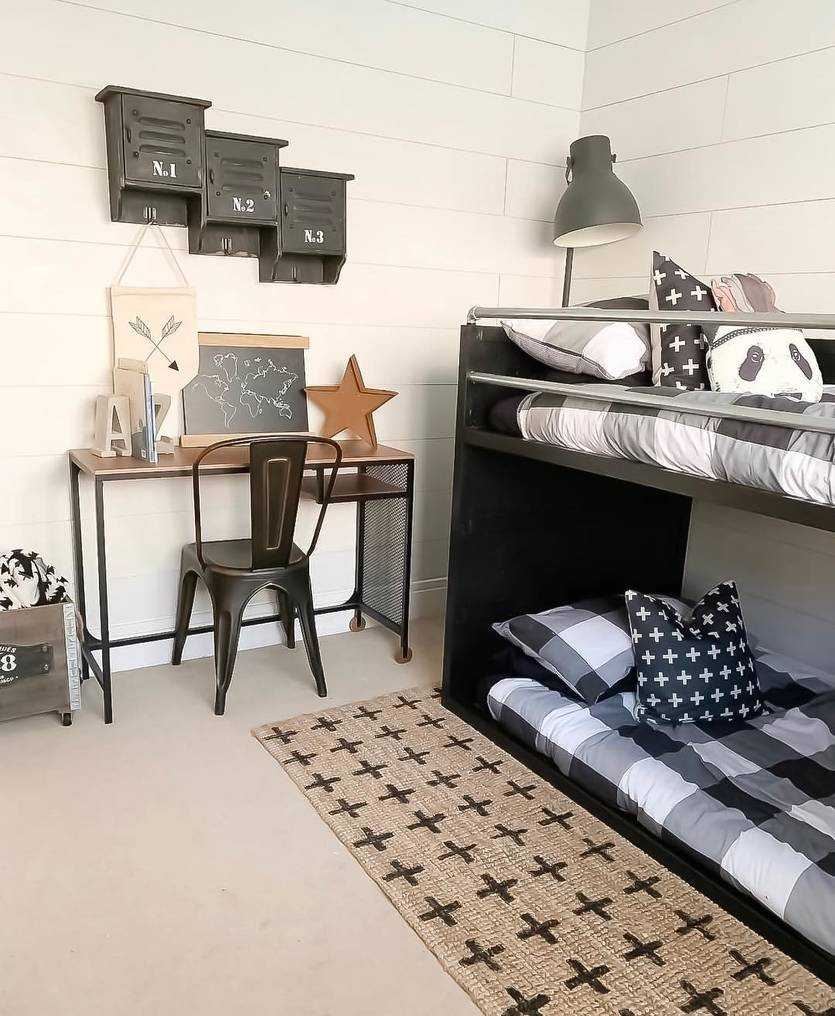 Обращаясь к индустриальной стилистике в дизайне не слишком большого помещения, предусмотрите достаточное освещение: затемненные углы могут сделать комнату подростка еще более маленькой, что точно не пойдет ей на пользу. Выигрышный ход — распределять источники света согласно функциональным зонам, например: