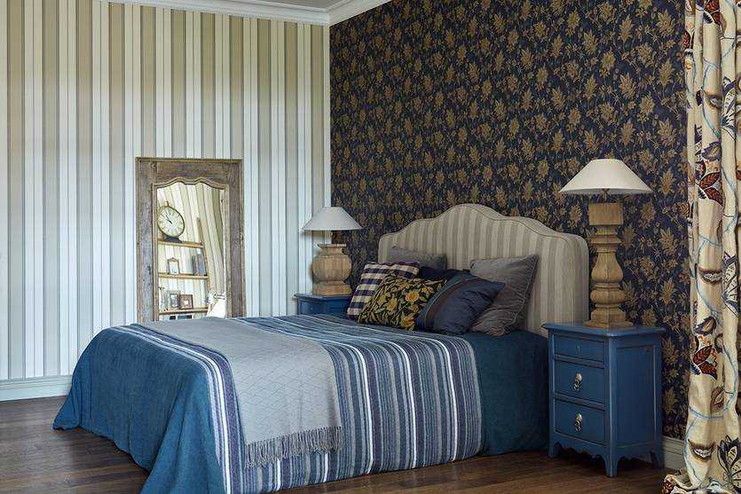 Классический интерьер придется по нраву не каждому – он смотрится чрезмерно строго. Это правильные формы, натуральные материалы, шкафы с филенчатыми дверцами, высокая кровать на точеных ножках, зеркало в резной раме. Чтобы разнообразить оформление, на стены клеят обои с ярким рисунком. Обязательный атрибут – многорожковая, предпочтительно хрустальная люстра.