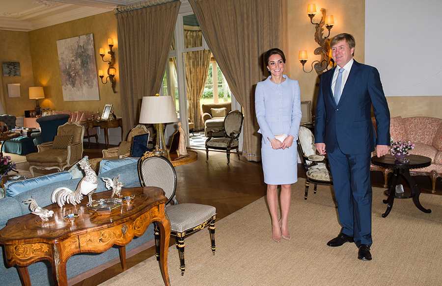 Среди некоторых потрясающих особенностей — диван от Chippendale с золотой подкладкой, на котором сидят герцог и герцогиня Кембриджские, а также роскошный ковер Axminster 18 века с голубым и бронзовым рисунком. Если вы внимательно присмотритесь к фотографии, то сможете увидеть портрет Королевы, висящий на заднем плане.