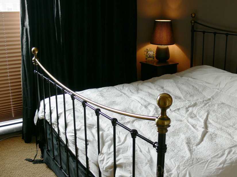 кованная спинка с замысловатым узором украсит эклетичный интерьер спальни