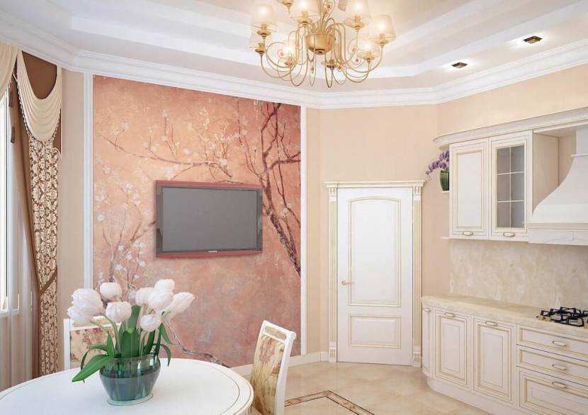 Классический. Для строгой и элегантной классической кухни подбирают натуральные оттенки: телесный, пудровый, светло-абрикосовый. Их комбинируют с белыми и бежевыми красками интерьера.