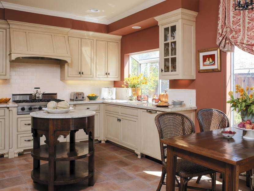Шебби-шик. Для ретро-интерьера выбирают самые светлые оттенки (бледно-персиковый, пудровый, светло-абрикосовый) и используют их по максимуму, в отделке стен, в декоре, в текстиле. Кухня будет выглядеть милой и уютной, если дополнить нежную палитру коралловым, дынным, цветом тунца и папайи.