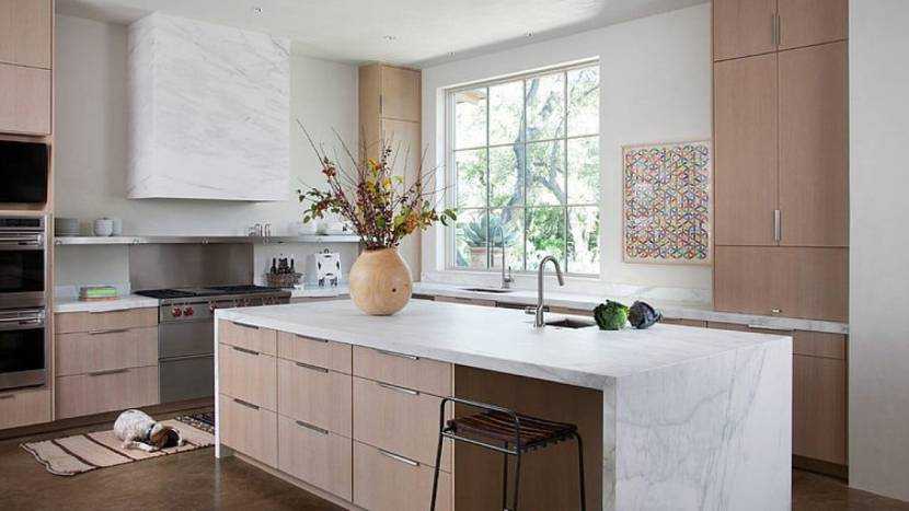 Если окна выходят на юг, сделать кухню прохладнее позволит использование в дизайне сине-голубых цветов.