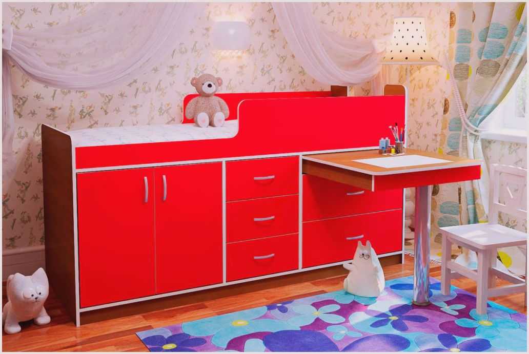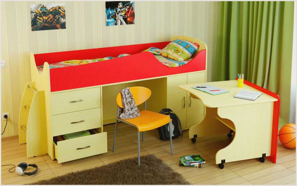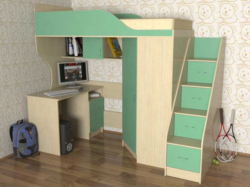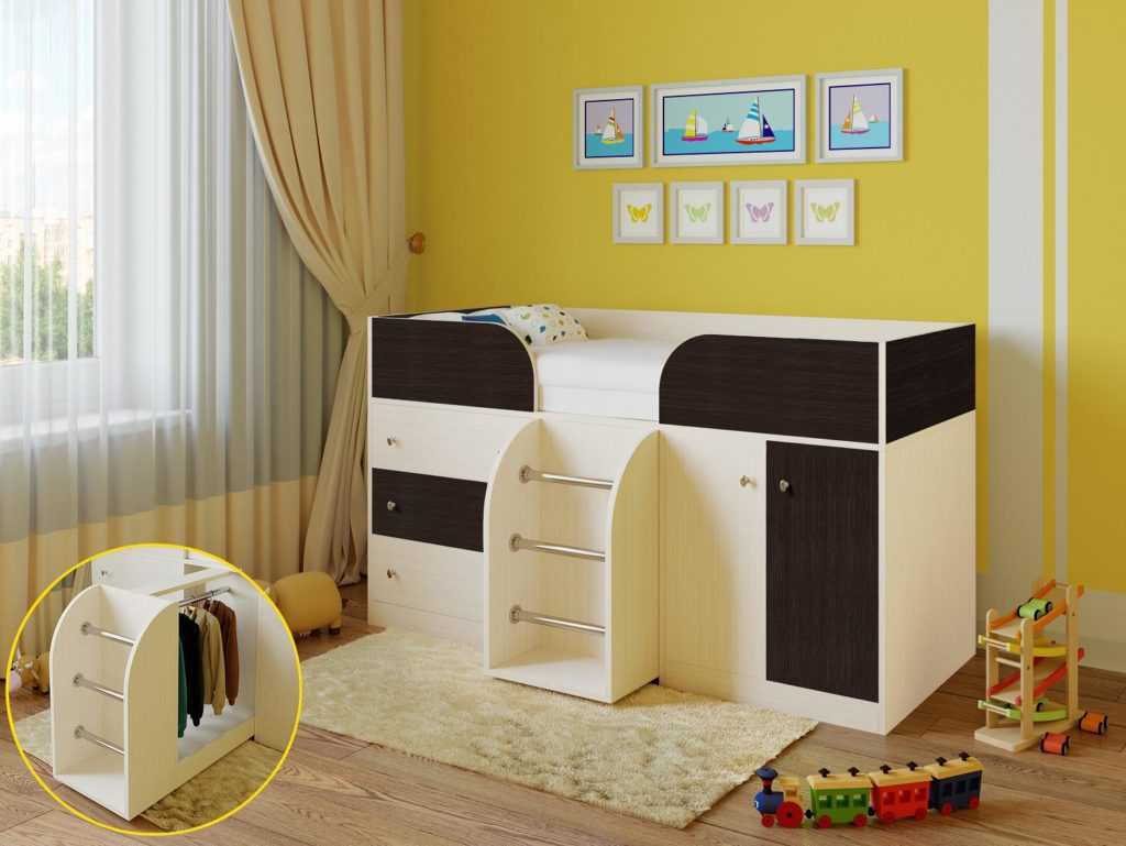 Есть варианты детских кроватей-чердаков со шкафом и столом или с полками. Такая конструкция позволяет сэкономить место, поэтому отлично подходит для однокомнатных или малогабаритных квартир. Но совмещение стола и шкафа может мешать ребенку полноценно заниматься.