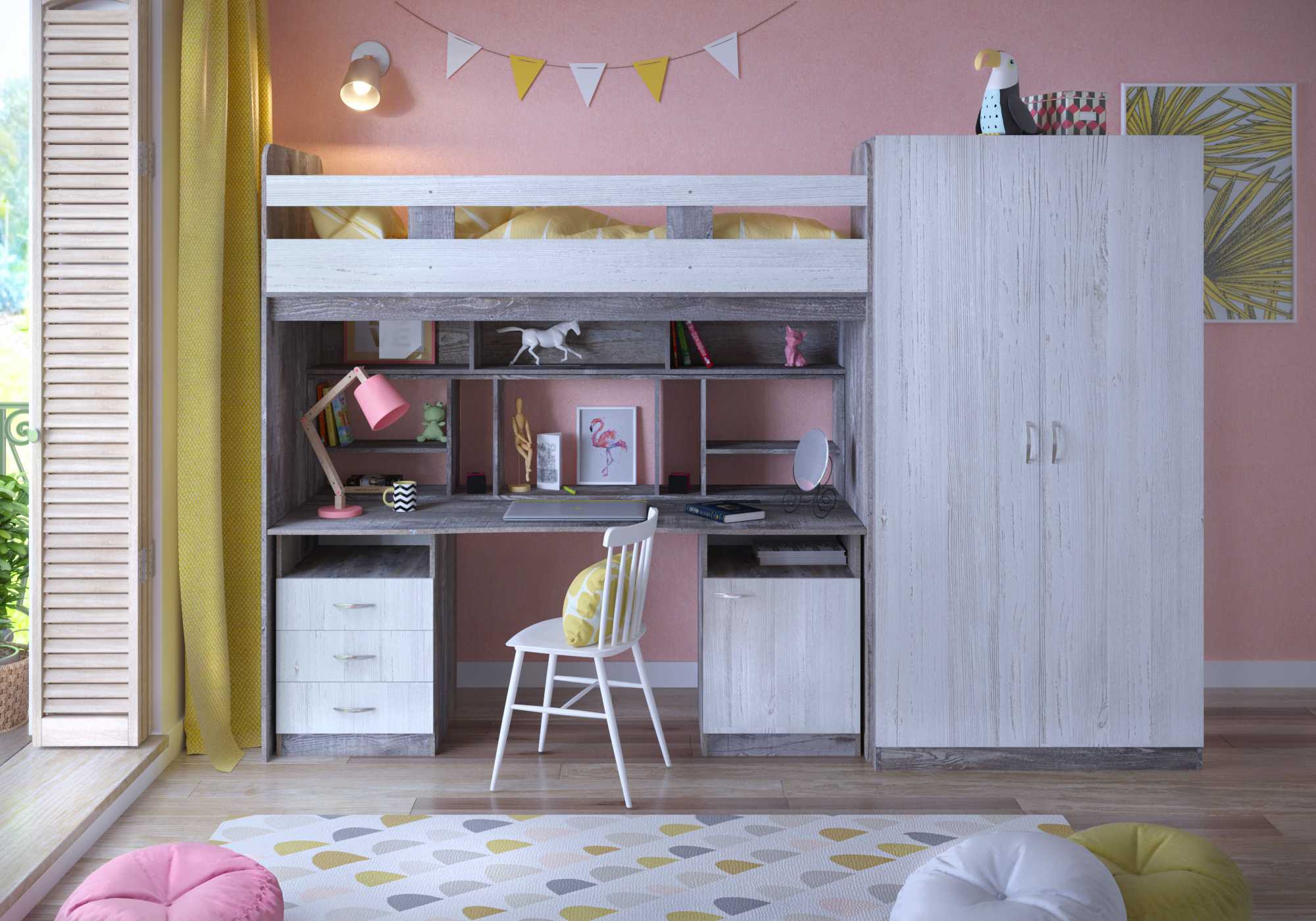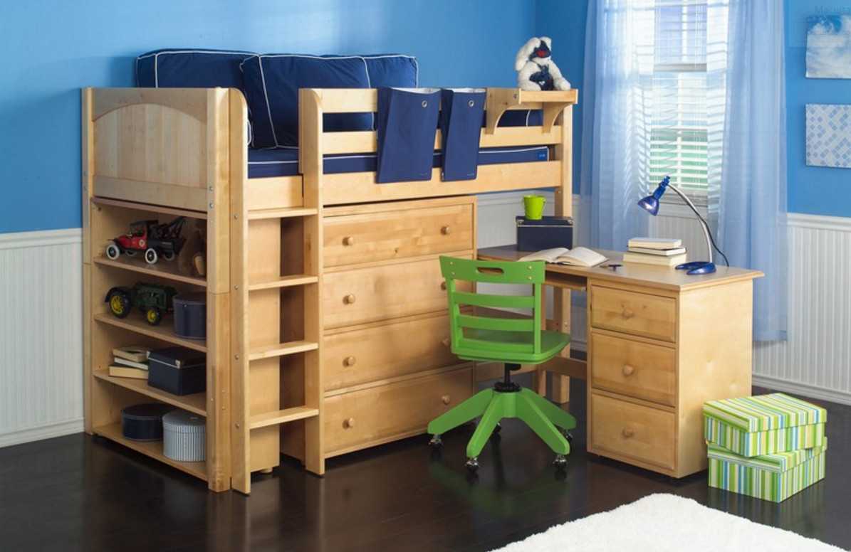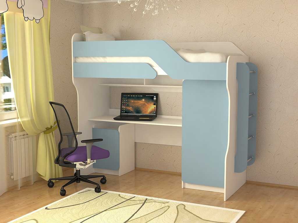 Удобна для детей кровать-чердак с рабочей зоной внизу. В ней располагают стационарный или мобильный стол и ящики