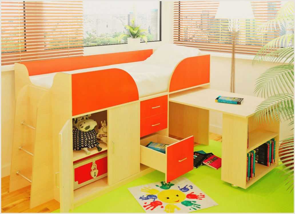 - До 1м. Как правило, этот недорогой детский вариант кровати-чердака для дошкольников. Снизу располагаются ящики и полки для вещей или зона для игр малыша. Бывают модели с откидным или выдвижным столом, который располагается сбоку от зоны сна;