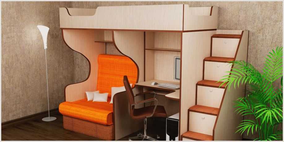 - организация рабочей зоны — помимо необычного нахождения спального пространства, появляется интересное и непривычное место для учёбы, игры, работы, в зависимости от выбранного варианта кровати;