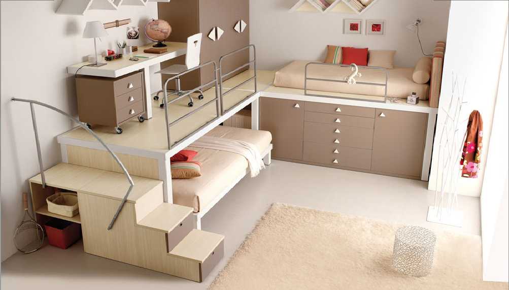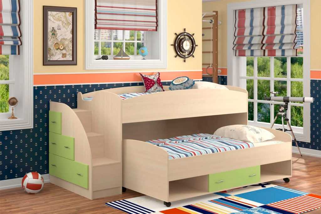Если у вас двое детей, то производители могут предложить угловые модели, в которых спальные места размещены перпендикулярно друг другу.