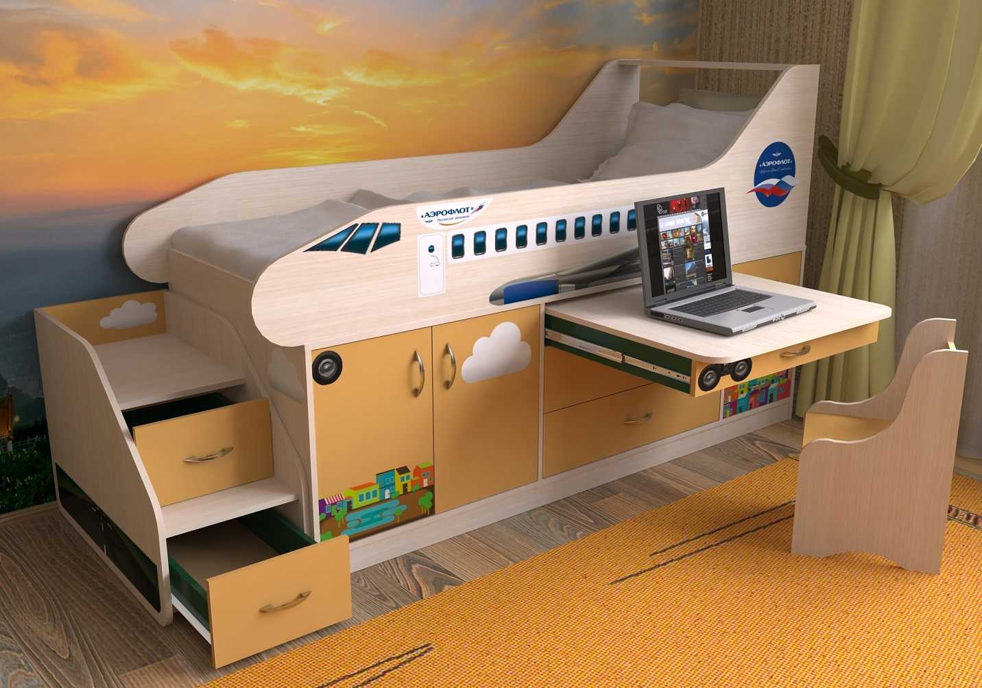 На пол обязательно нужно постелить мягкий ковёр яркой расцветки с небольшим ворсом. Дополнят оформление комнаты красивые шторы. Все эти детали будут создавать уют и гармонию в детской. Стены и фасады мебели можно украсить яркими стикерами и наклейками, изображающими персонажей из любимых сказок.