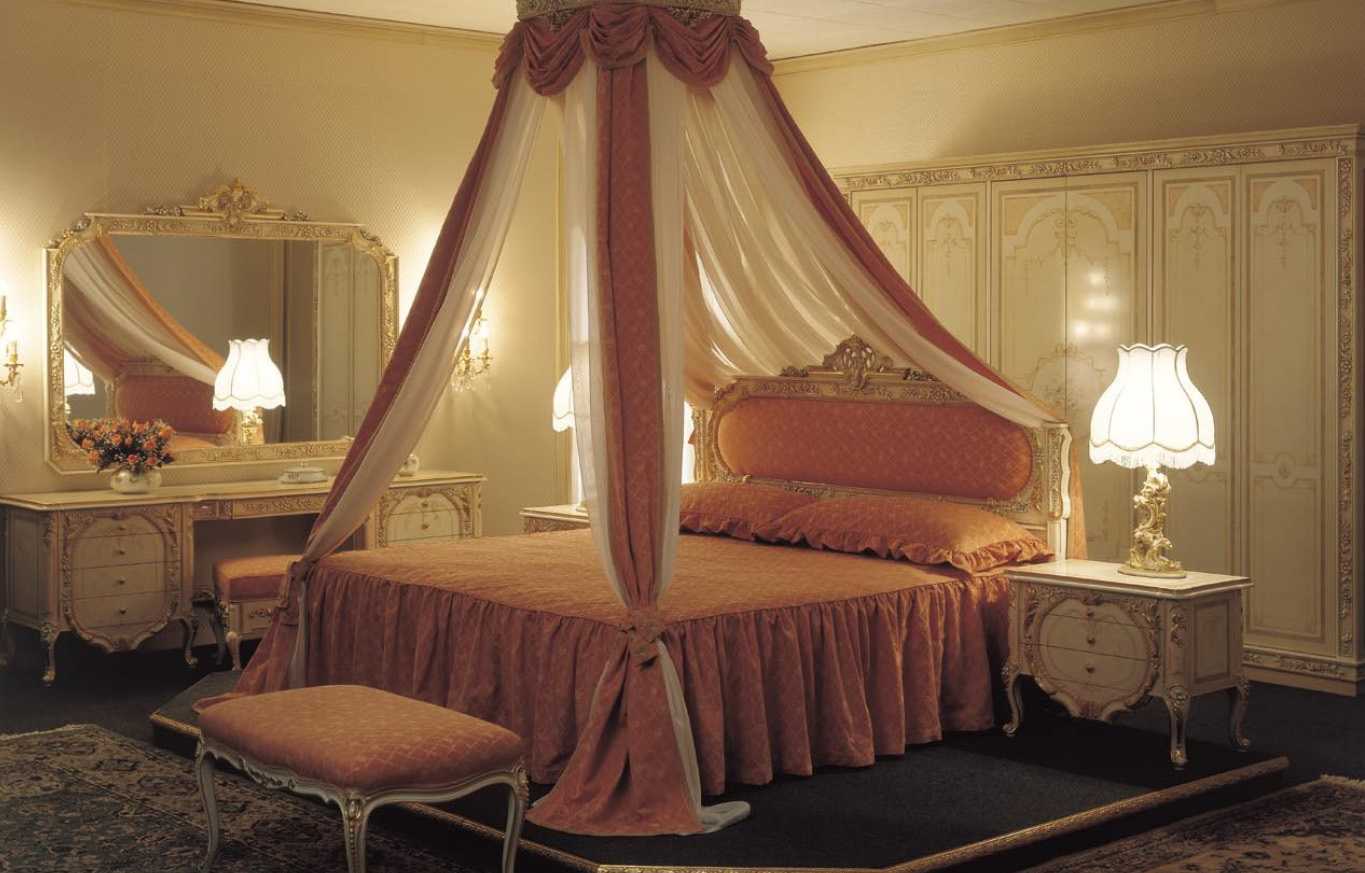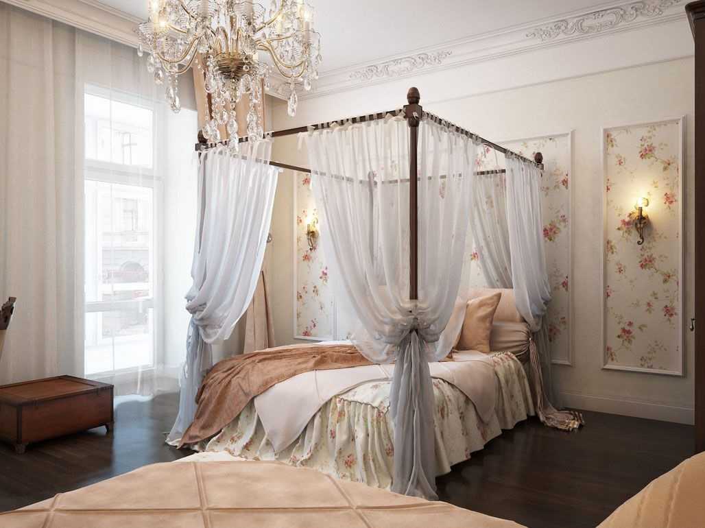 Чаще всего балдахины дополняют кровати, сделанные в духе барокко, ампира и классицизма. Вместо реек, каркасной основой для крепления накидок могут служить римские колонны.