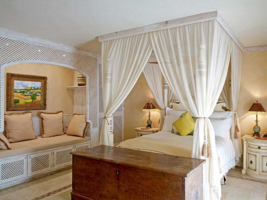С помощью балдахина дизайнеры могут выполнить и визуальную коррекцию высоты потолков. Их конструкционные особенности и массивность прекрасно скрадывают пространство, чем делают декор спален с высокими потолками неимоверно уютным.