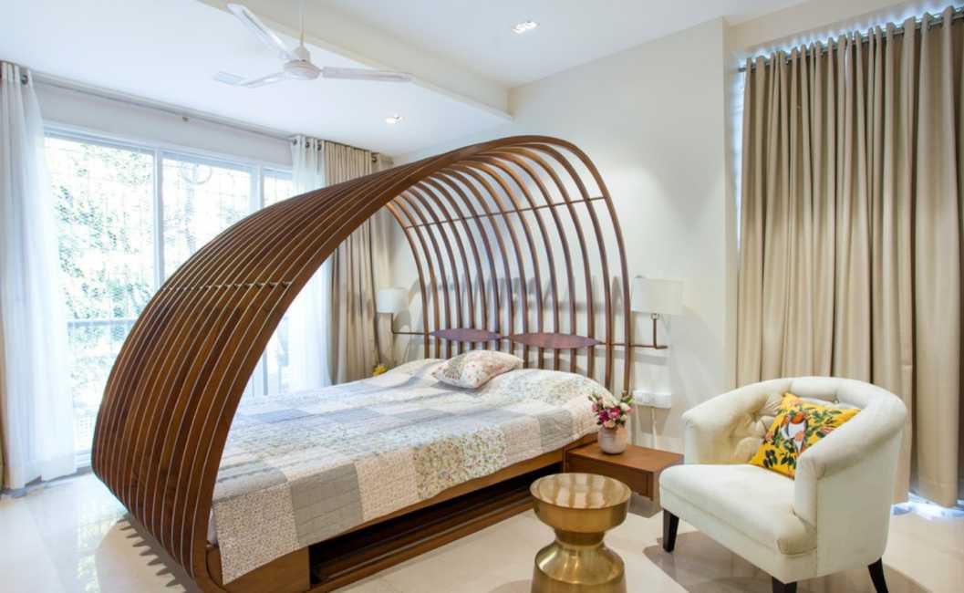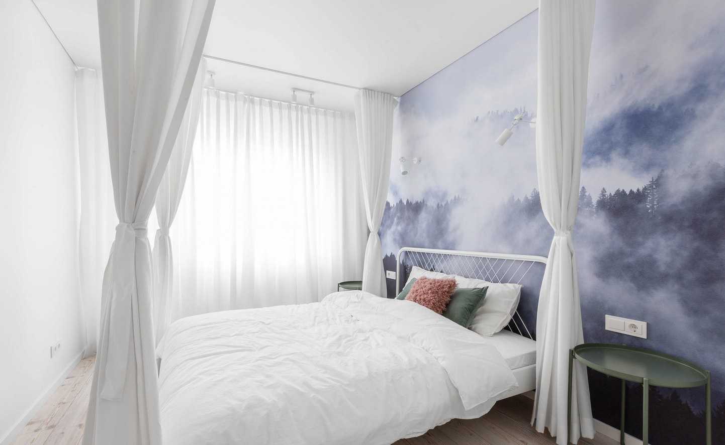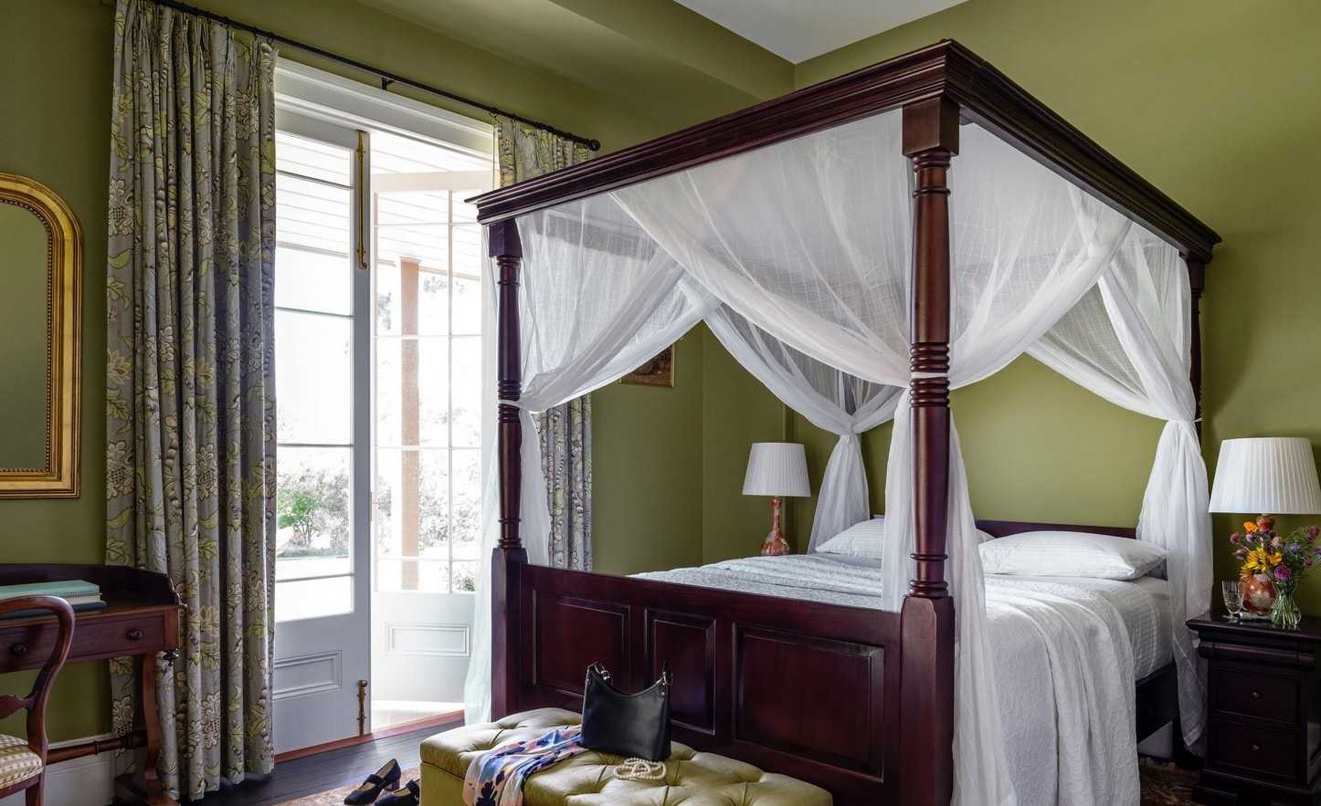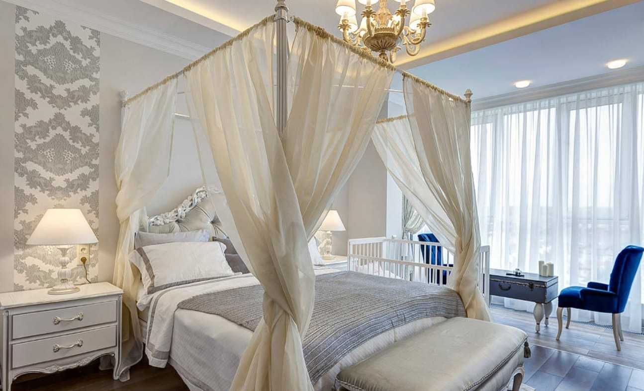 Кровать с балдахином сделает спальню с высокими потолками уютнее