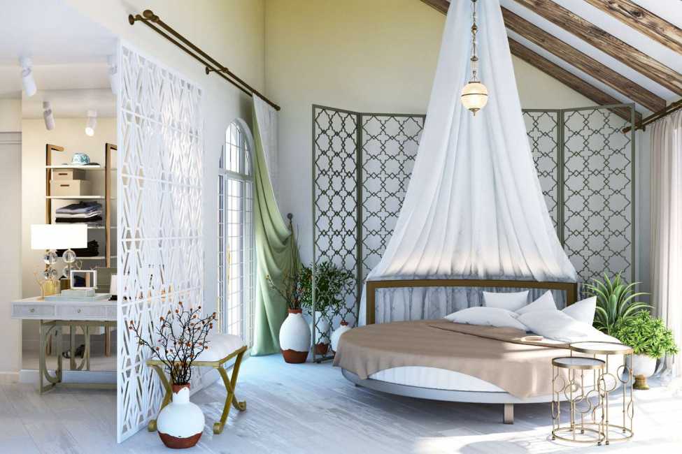 Для круглой кровати подходят романтичные зеркала, пуфики, плафоны. Всё должно быть округлой формы с плавными линиями. Нужно отказаться от предметов с острыми углами.