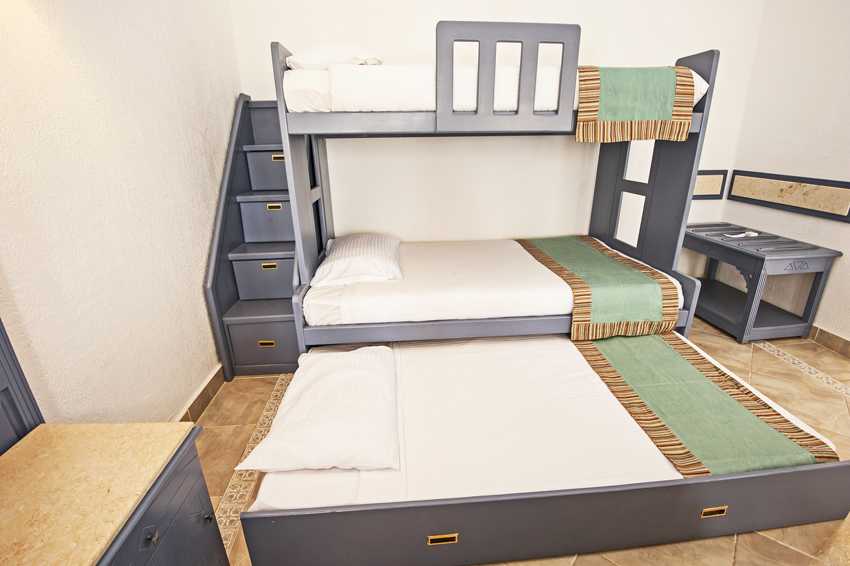 Существует наиболее компактный вариант, когда под верхней кроватью располагаются два выдвижных спальных места. В разложенном виде такая конструкция напоминает ступеньки. Подобная модель позволит существенно сэкономить полезное пространство, которое днем можно использовать для игр. К тому же стоимость данной трехместной кровати будет намного ниже, чем общая сумма, затраченная на покупку отдельных стационарных вариантов.