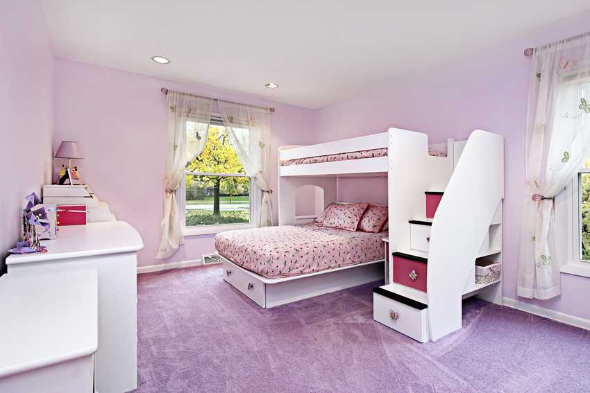 Лестница в такой модели состоит из ящиков либо полок, что, с одной стороны, несколько увеличивает размеры конструкции, а с другой – позволяет отказаться от размещения шкафа. Также под нижней кроватью может располагаться бельевой пенал.