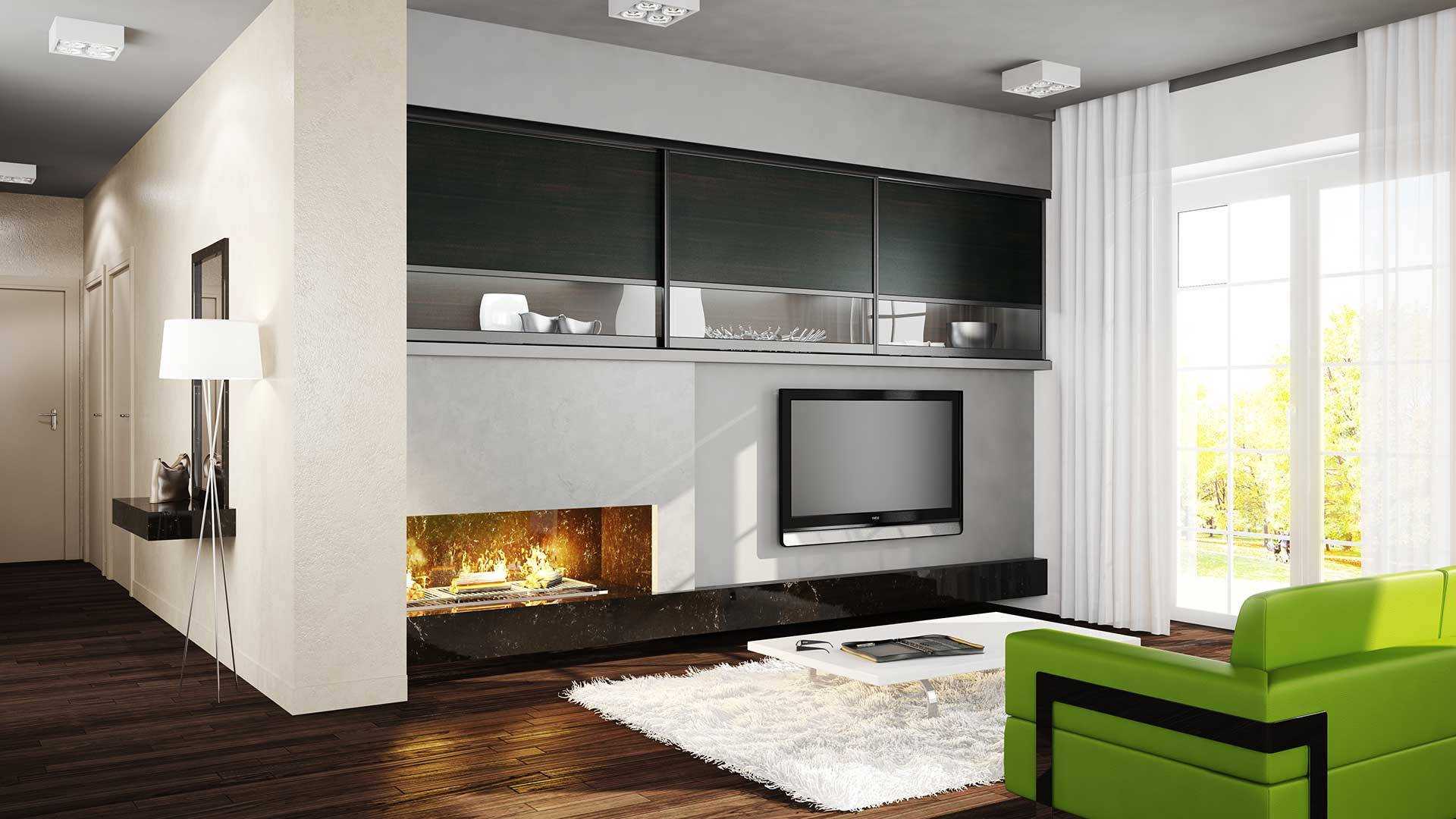 Здесь отлично смотрится встроенный шкаф с нишей в центральной части и стеллажами по бокам. Она может «обрамлять» камин или медиа-зону, одновременно выполняя функцию места для хранения и презентации различных вещей. При отсутствии телевизора центром композиции может стать аквариум. Для современной гостиной выбирается мебель из ЛДСП, МДФ с раздвижными дверцами. В классическом интерьере хорошо смотрится деревянная конструкция с распашными створками.