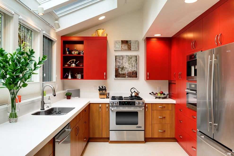 В рабочей зоне комнаты монтируют шкафы. Там размещают посуду, различную утварь, мобильную и встраиваемую технику. Основное достоинство мебели — она хорошо вписывается в любую конфигурацию и дизайн кухни. Кроме этого, конструкции маскируют инженерные коммуникации (водопроводные, канализационные, вентиляционные трубы). При этом они бывают разными: