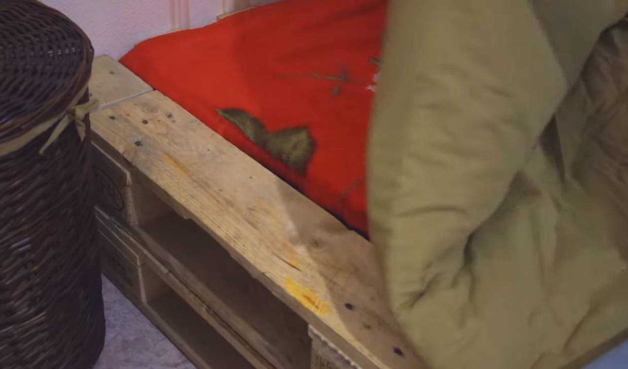 Шаг 10. Обработайте готовую конструкцию лаком или другим видом покрытия и после его высыхания можно стелить одеяла и покрывала. На самый низ желательно постелить ненужное одеяло, чтобы закрыть щели между досками поддона.