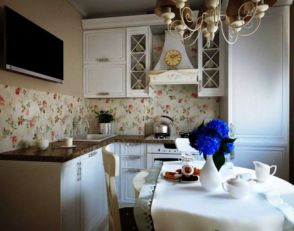 Для мебели и полов необходимо использовать дерево, для штор и всевозможных тканевых кухонных приспособлений – натуральные полотна, для столешницы рабочей зоны подойдёт камень. Можно разработать дизайн со стеклянными вставками на верхних шкафах или с хрустальной люстрой.