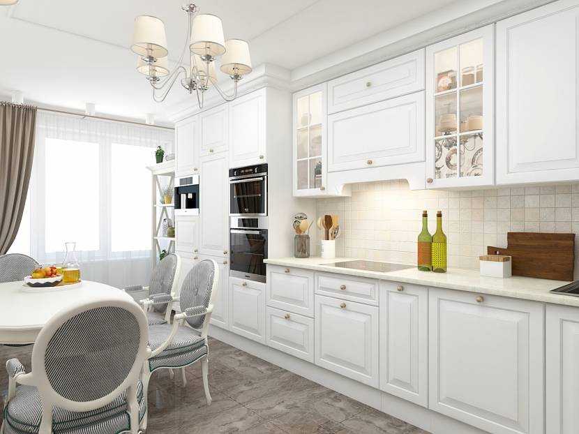 Достаточно гармоничный и универсальный оттенок. В практике классического дизайна применяется много лет. Его можно встретить в разных декоративных элементах. Чаще всего занимает большие площади: стены, потолок, используется для дверных полотен. К преимуществам белого цвета в классическом интерьере кухни стоит отнести: