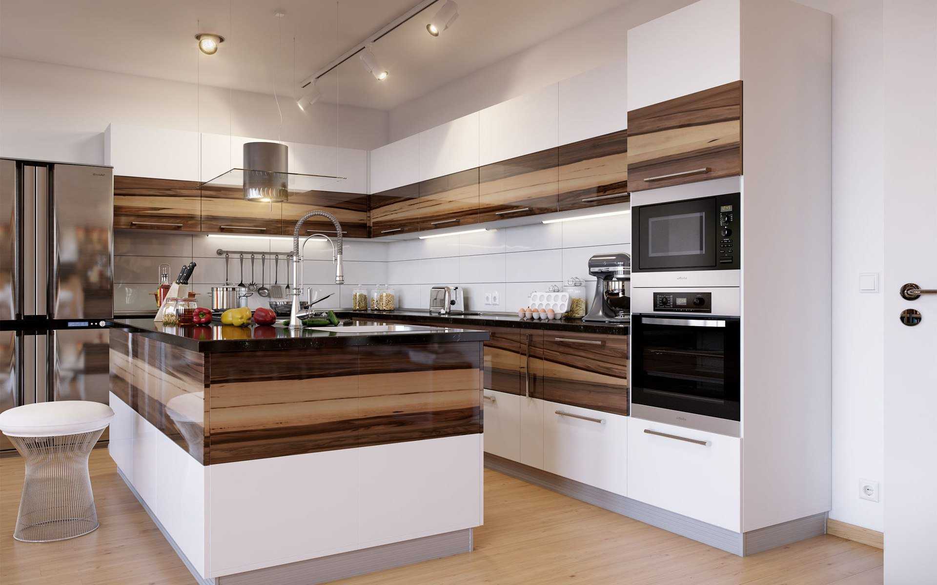 Необходимо выбрать удобную кухонную планировку, правильно расставить мебель и подобрать аксессуары, определить для себя практичные кухонные фасады, столешницу, фартук, пол.