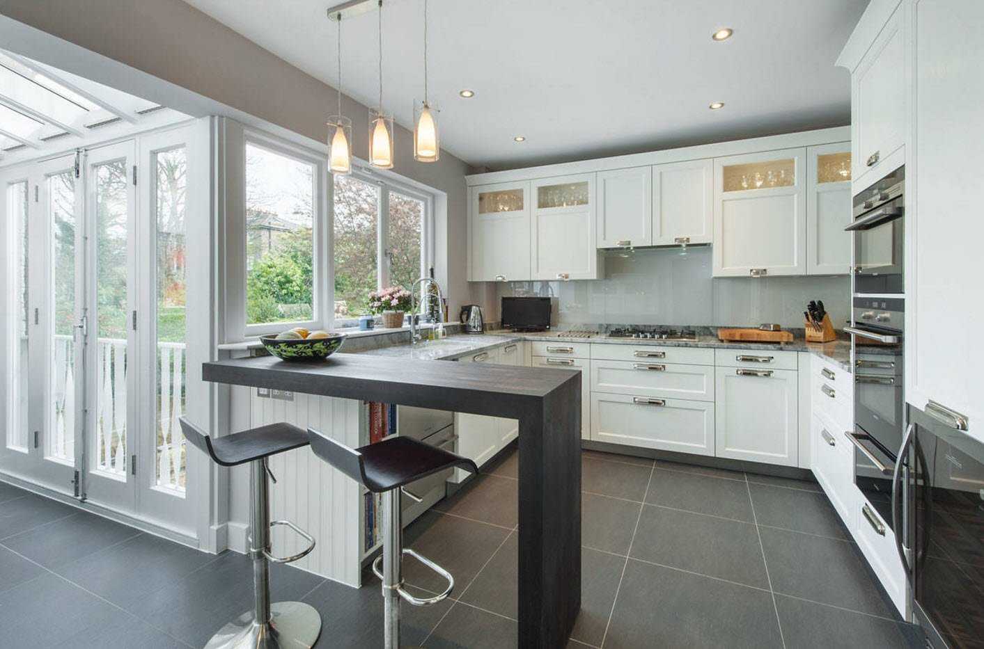 Еще одна деталь, нехарактерная для традиционного оформления — барная стойка. Она гармонирует с остальной мебелью, так почему бы и нет? Это не только модно, но весьма практично. Такое добавление может заменить обеденный стол для небольшой семьи или стать местом вечерних посиделок с друзьями.