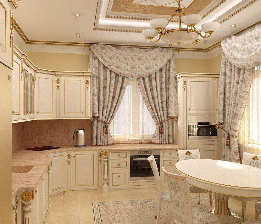Ещё одна особенность в дизайне классической кухни – огромное количество всевозможного декора. Для классики важен торжественный вид, который создаёт атмосферу вечного праздника и изысканности. Подобные впечатления дарят лепнина из гипса, кованные и резные детали, керамические изделия и драпировка на шторах.
