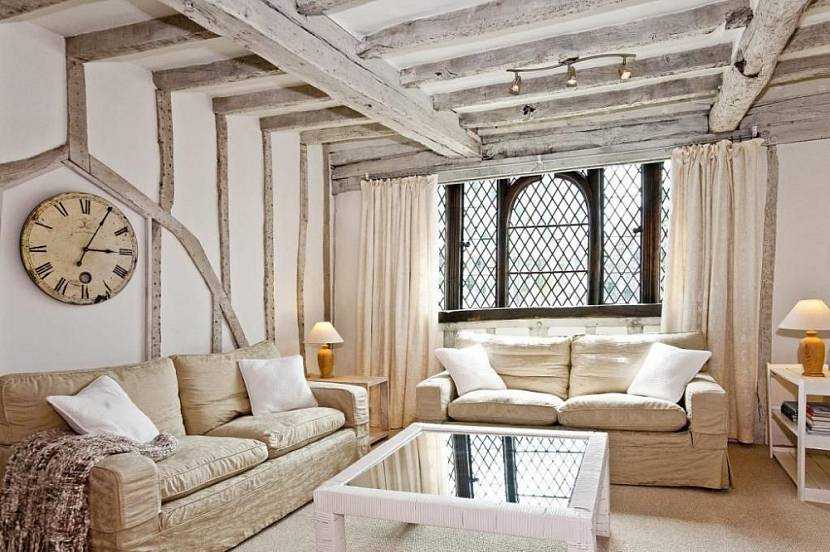 Типичный способ оформления потолка в деревенском доме — выкрашенная белой краской поверхность, снабженная деревянными балками. Грубые балки из состаренной древесины создадут необходимую атмосферу загородного жилья, но они вряд ли будут уместны в гостиной в деревенском стиле, оформляемой в помещении с низкими потолками.