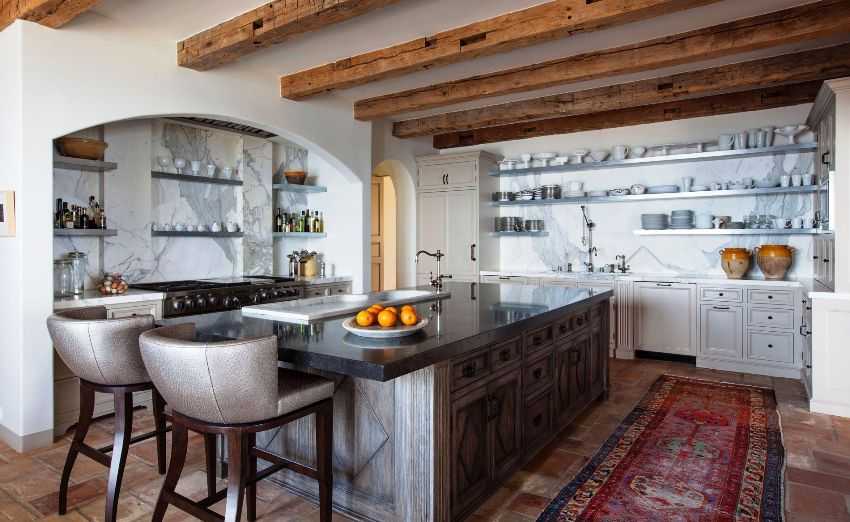 - открытые стеллажи и полки. На кухнях принято оставлять на виду посуду, поделки и сувениры.